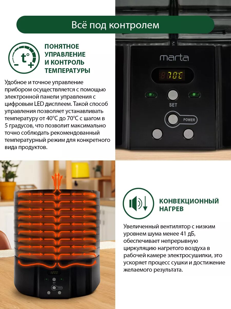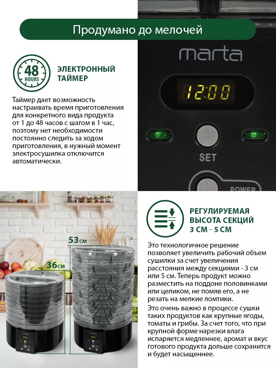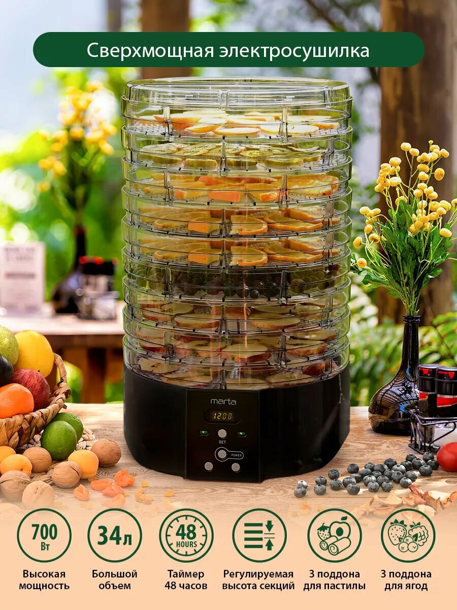 MARTA MT-FD1886C 15 поддонов-9+3 для пастилы+3 для ягод черный жемчуг сушилка д/фруктов,овощей