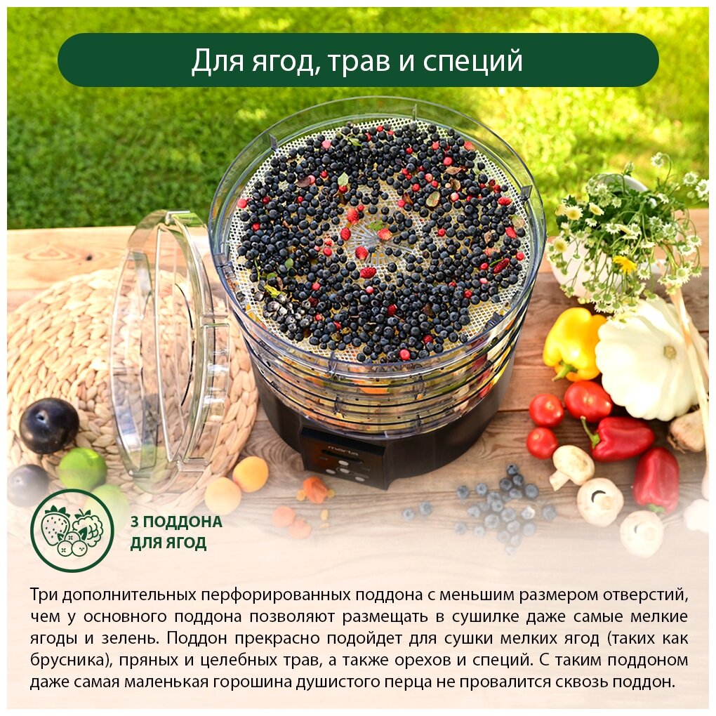 Дегидратор сушилка для овощей электросушилка MARTA MT-FD1886C 15 поддонов (9 основных + 3 для пастилы + 3 для ягод) черный жемчуг