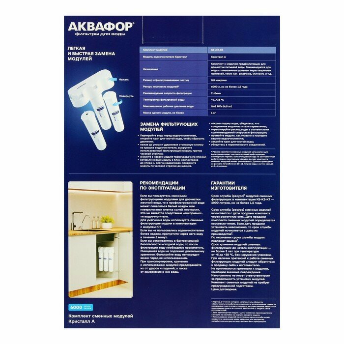 | Дополнительная информация | для фильтра Кристалл А; в комплекте три модуля: K5 - предварительная очистка; K2 - глубокая фильтрация; K7 - финишная очистка |