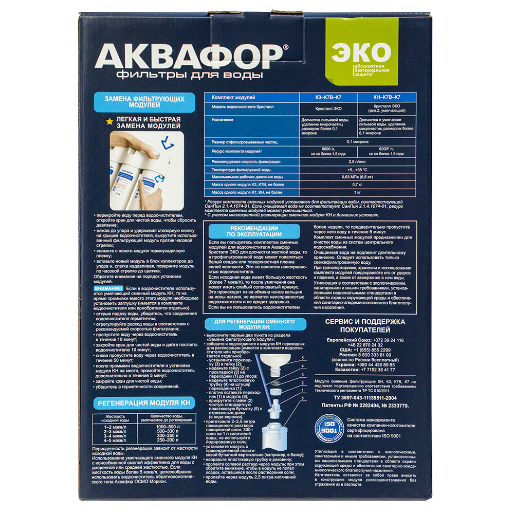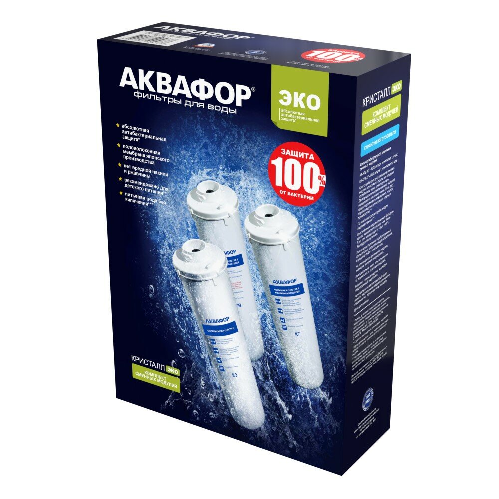 | Дополнительная информация | для фильтра Кристалл Эко; в комплекте три модуля: K3 - предварительная очистка; К7В - очищает воду от бактерий и паразитов; K7 - финишная очистка |