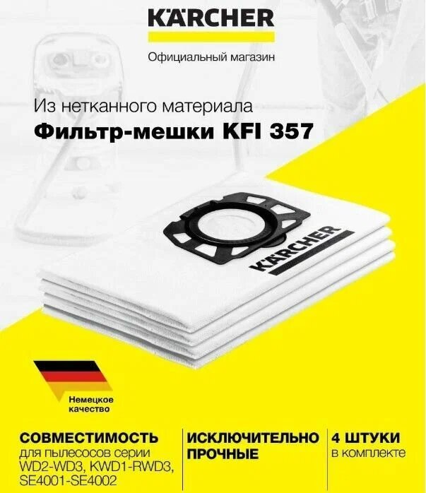 Фильтр-мешки Karcher 2.863-314.0 из нетканного материала KFI 357 (пылесосы WD), 4 шт.