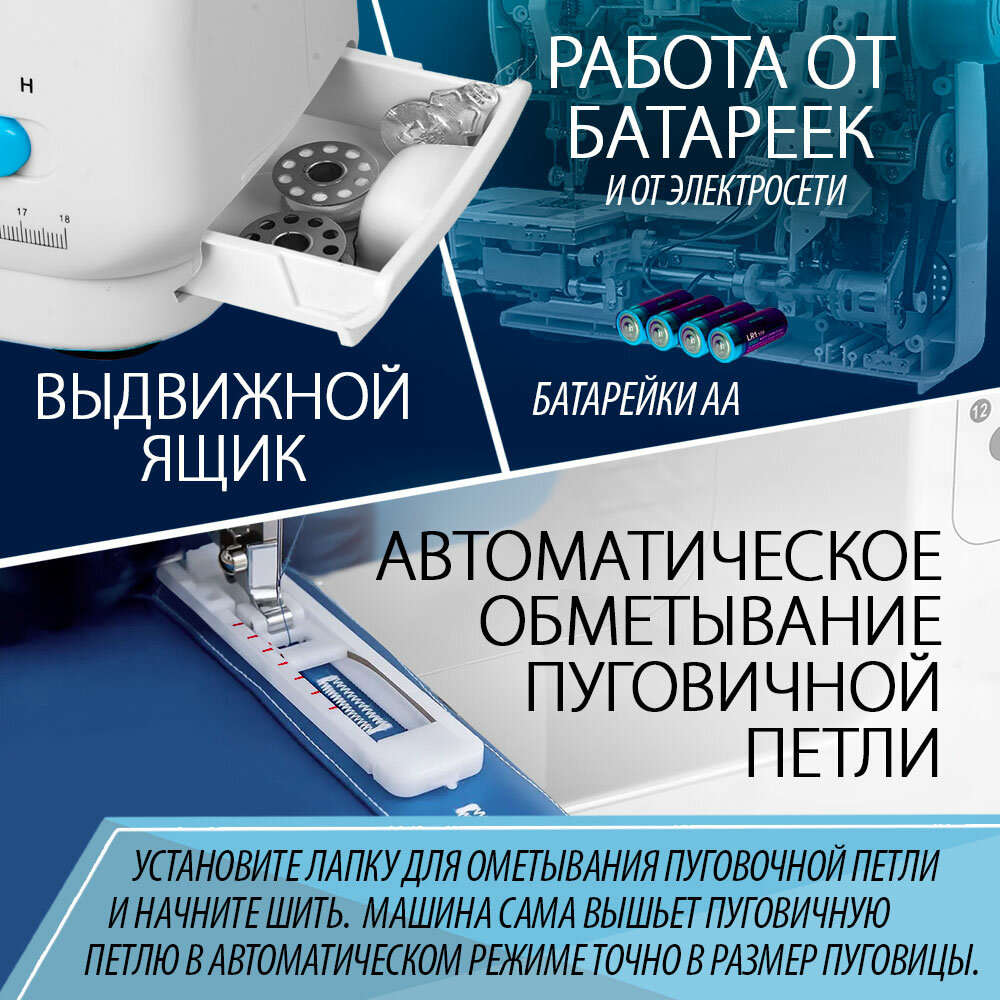 | Дополнительная информация | мощность 7,2 Вт, длина шнура 1,5 м, работа от сети и от батареек, 4 батарейки, 2 скорости работы, прямой и обратный ход при шитье, обработка петли, удобная система заправки нити, автоматическая намотка нити, Отсек для аксессуаров, встроенная LED подсветка, возможность работы от батареек АА (в комплект не входят) или от адаптера 6 V 1200 mA |