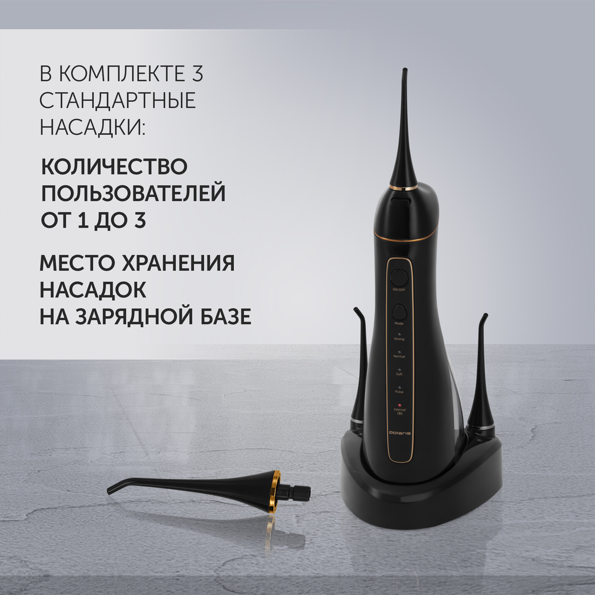 Ирригатор для полости рта Polaris PWF 0201 черного цвета, 5 насадок в комплекте, минимальное давление струи 172 кПа, максимальное давление струи 620 кПа