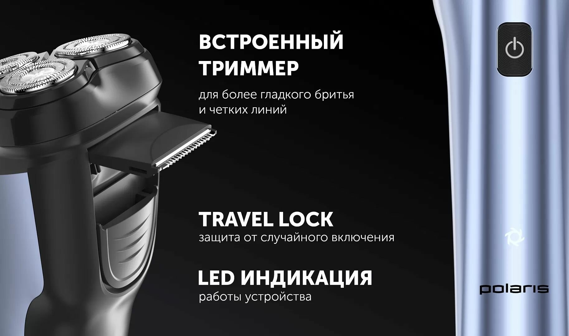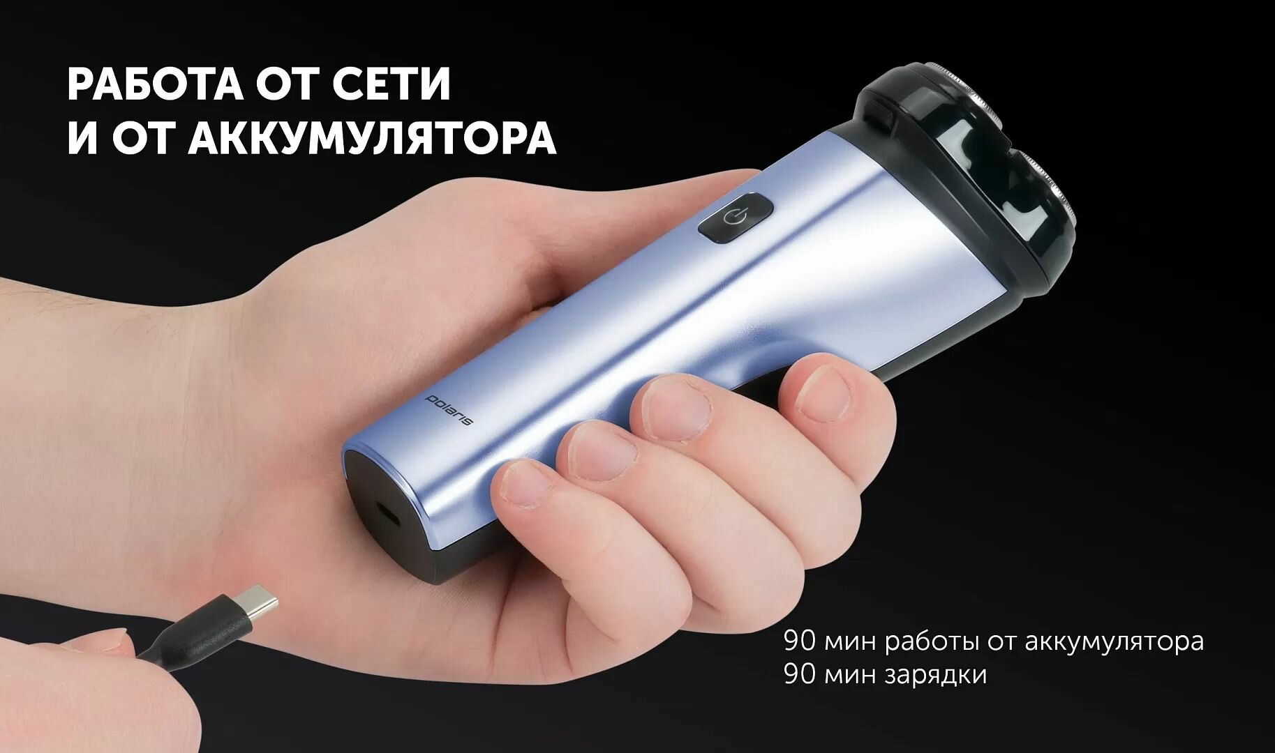 СохранитьБритва электрическая Polaris, роторная, для сухого и влажного бритья, быстрая зарядка, от сети и аккумулятора, синий металлик интересное:
