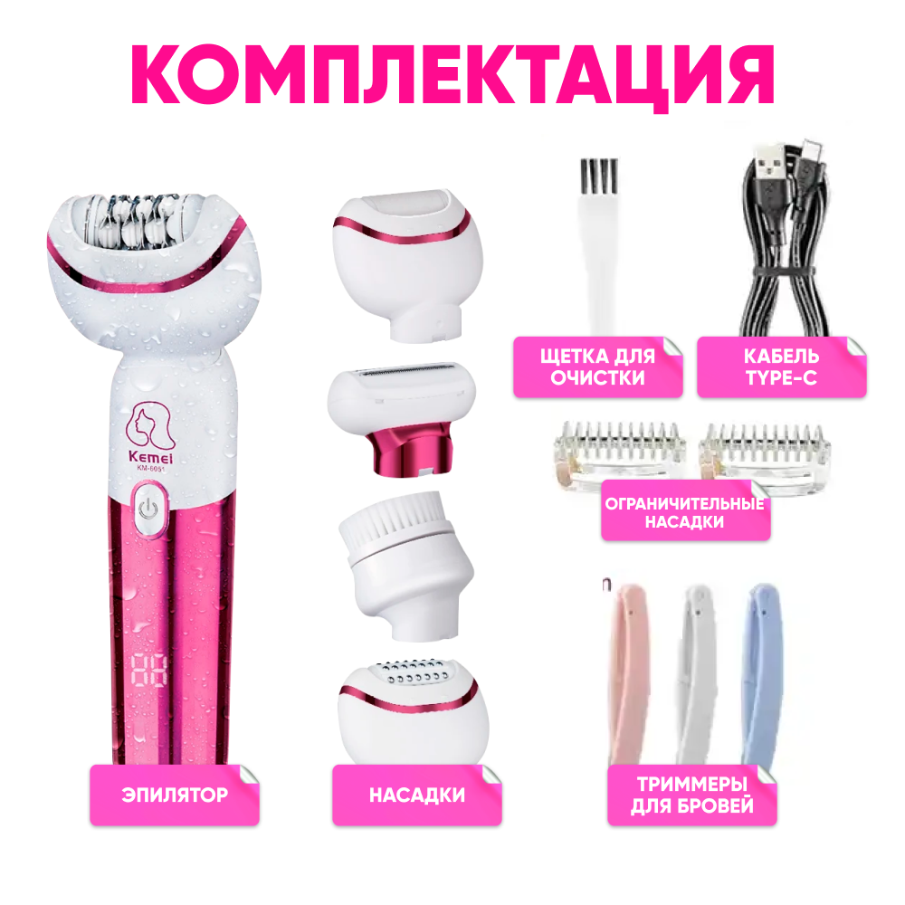 Ниже Вы можете прочитать отзывы на Эпилятор женский 5в1 Kemei KM-6051 беспроводной, белый / Машинка электрическая для удаления волос, депиляции с насадками, пилка для пяток, щетка для пилинга лица / Электробритва для ухода за телом, ознакомится с подробными характеристиками, посмотреть интересные обзоры и фотографии на Эпилятор женский 5в1 Kemei KM-6051 беспроводной, белый / Машинка электрическая для удаления волос, депиляции с насадками, пилка для пяток, щетка для пилинга лица / Электробритва для ухода за телом.