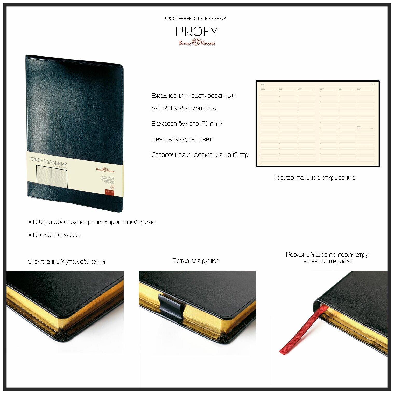 Купить Еженедельник BrunoVisconti недатированный, А4 (214 х 294 мм), "PROFY" черный 64 л., Арт. 3-098/02