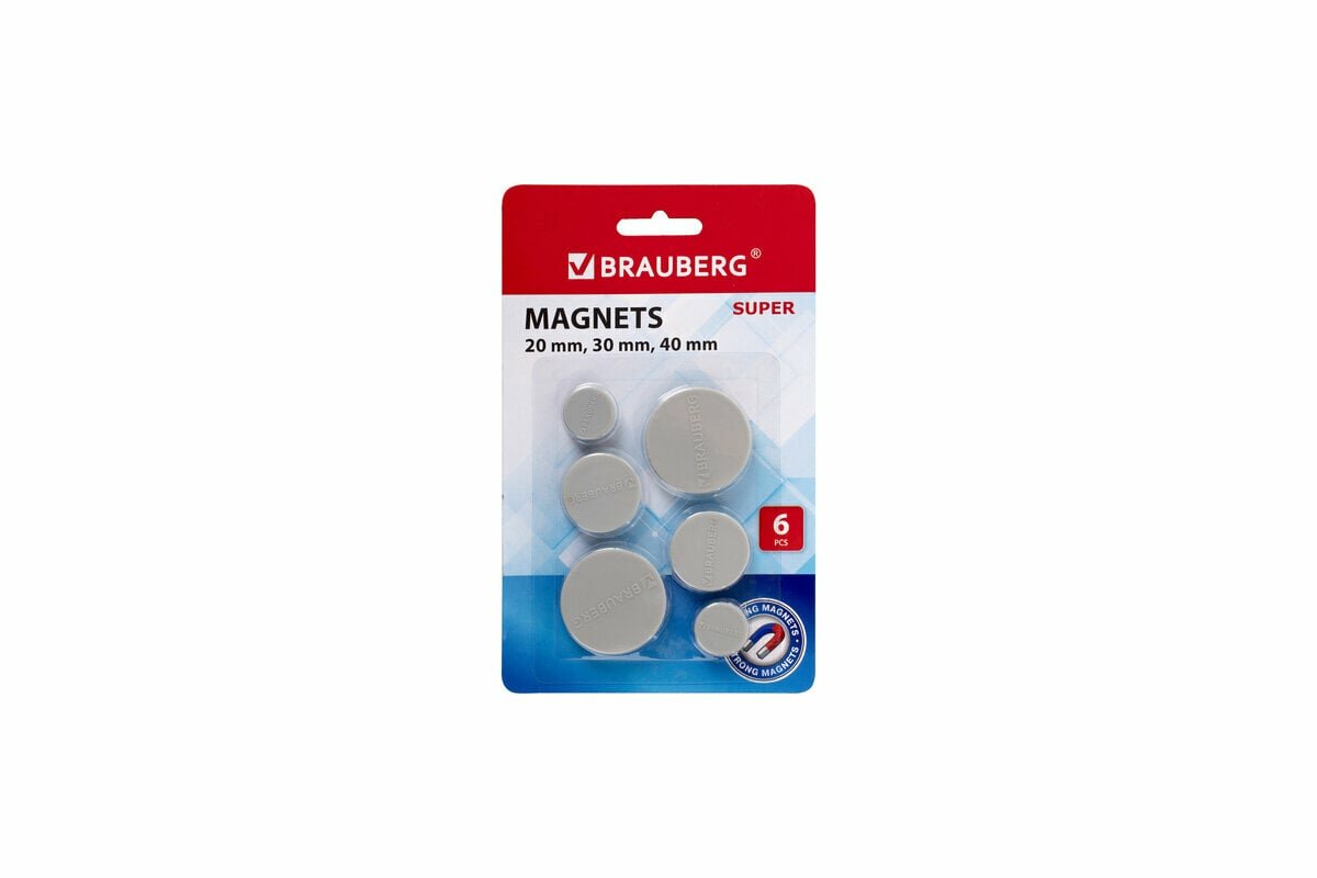 Магниты мощные, набор 20 мм - 2 шт., 30 мм - 2 шт., 40 мм - 2 шт., серые, BRAUBERG "SUPER", 237481 (цена за 1 ед.товара)