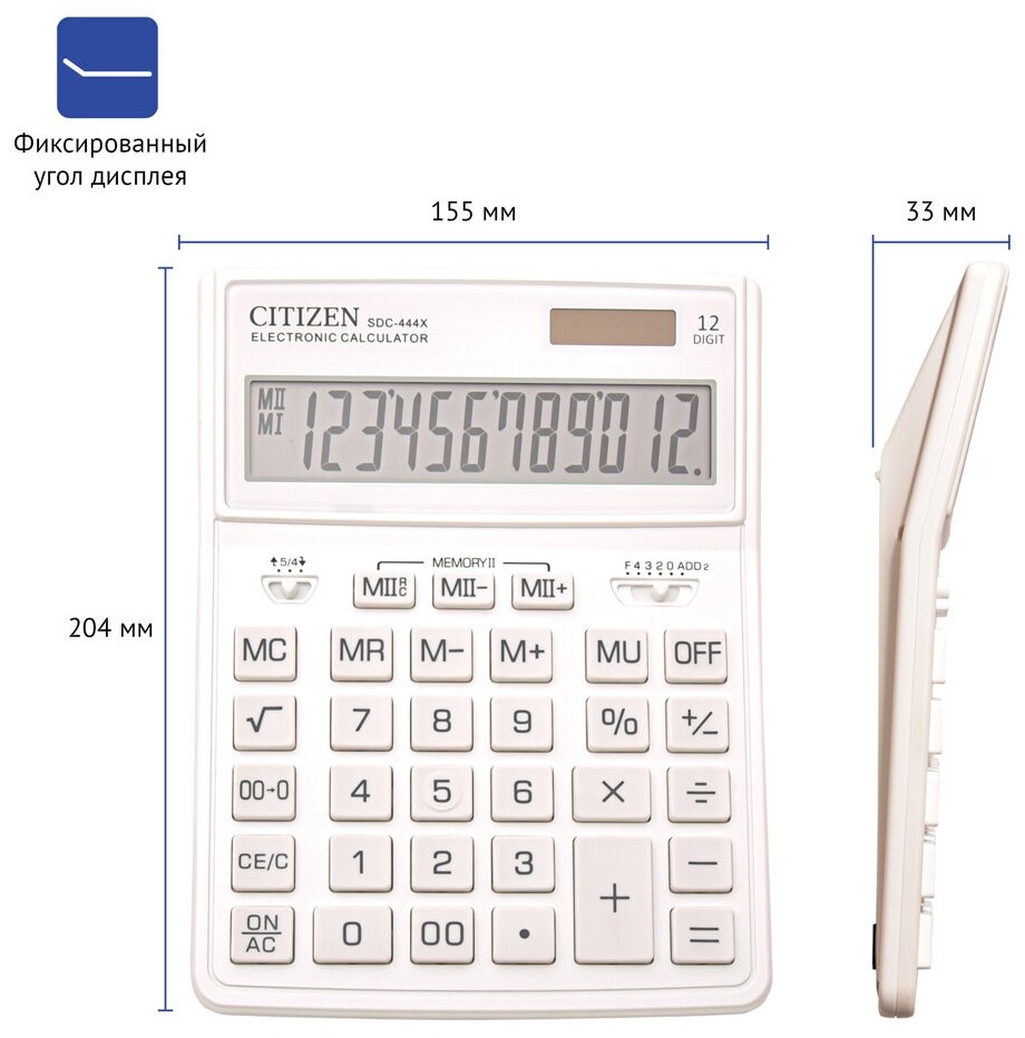 Калькулятор настольный Citizen "SDC-444XRWHE", 12-разрядный, 155 х 204 х 33 мм, двойное питание, белый
