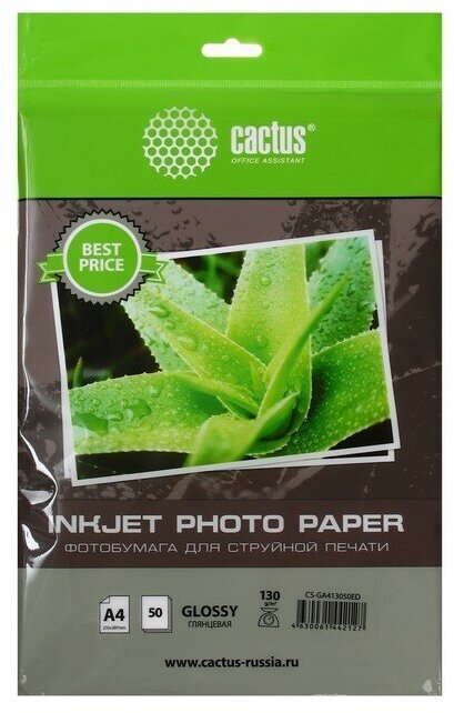 Фотобумага для струйной печати А4, 50 листов Cactus, 130 г/м2, односторонняя, глянцевая, в пакете