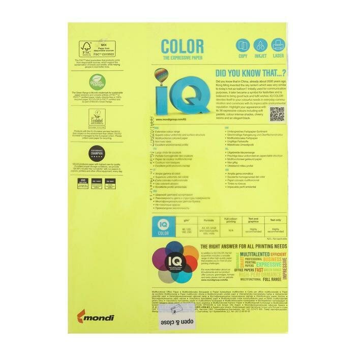 Ниже Вы можете прочитать отзывы на Бумага цветная IQ COLOR (А4,80г,NEOGB-желтый неон) пачка 500л. СПб, ознакомится с подробными характеристиками, посмотреть интересные обзоры и фотографии на Бумага цветная IQ COLOR (А4,80г,NEOGB-желтый неон) пачка 500л. СПб.