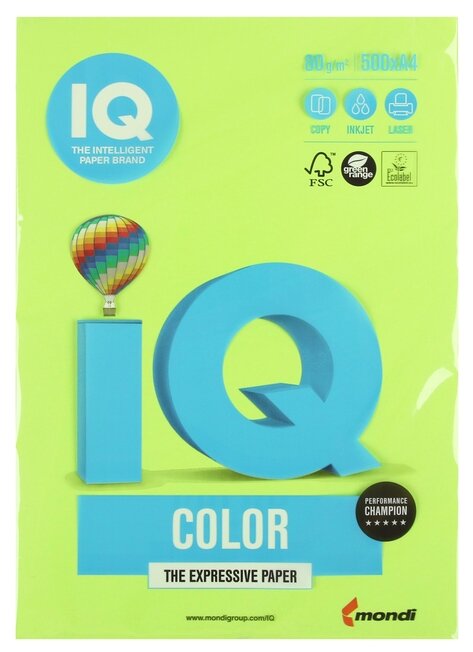 Бумага IQ "Color intensive" А4, 80г/м2, 500л. (ярко-зелёный), 1 шт