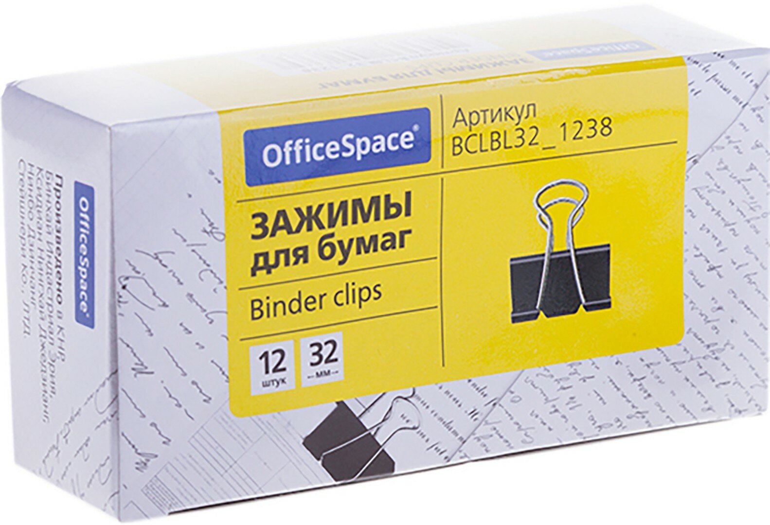 Зажимы для бумаг металлические OfficeSpace (32мм, до 140 листов, черные) в картонной коробке, 12шт. (BCLBL32_1238), 12 уп.