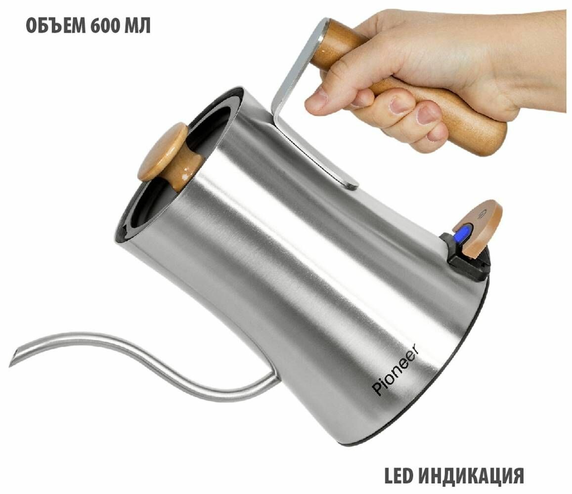 Электрический чайник Pioneer из нержавеющей стали с деревянной ручкой, 0,6 л, LED индикация, автоотключение при закипании и снятии с базы, 1800 Вт