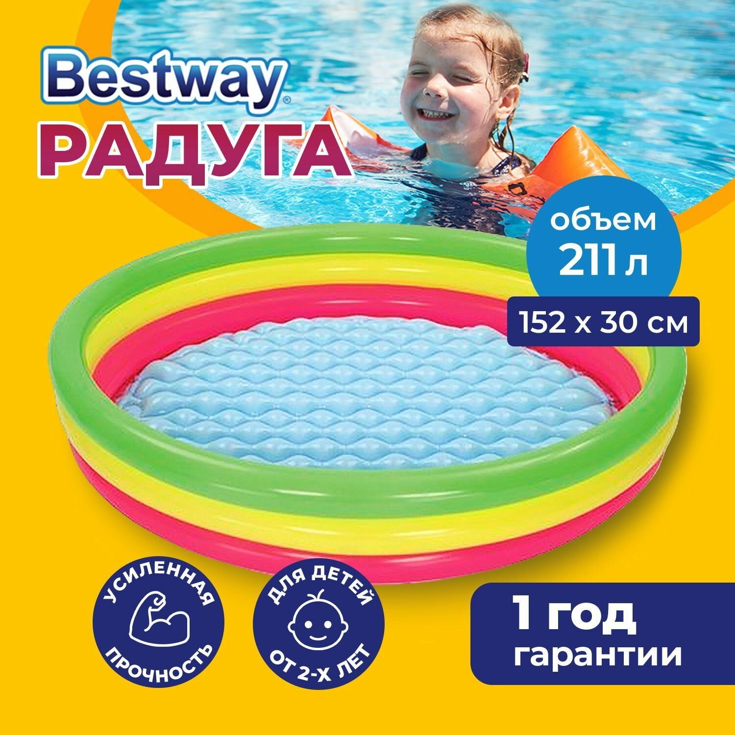 Детский надувной круглый бассейн 152х30 см, 211 л, Bestway "Радуга", артикул 51103