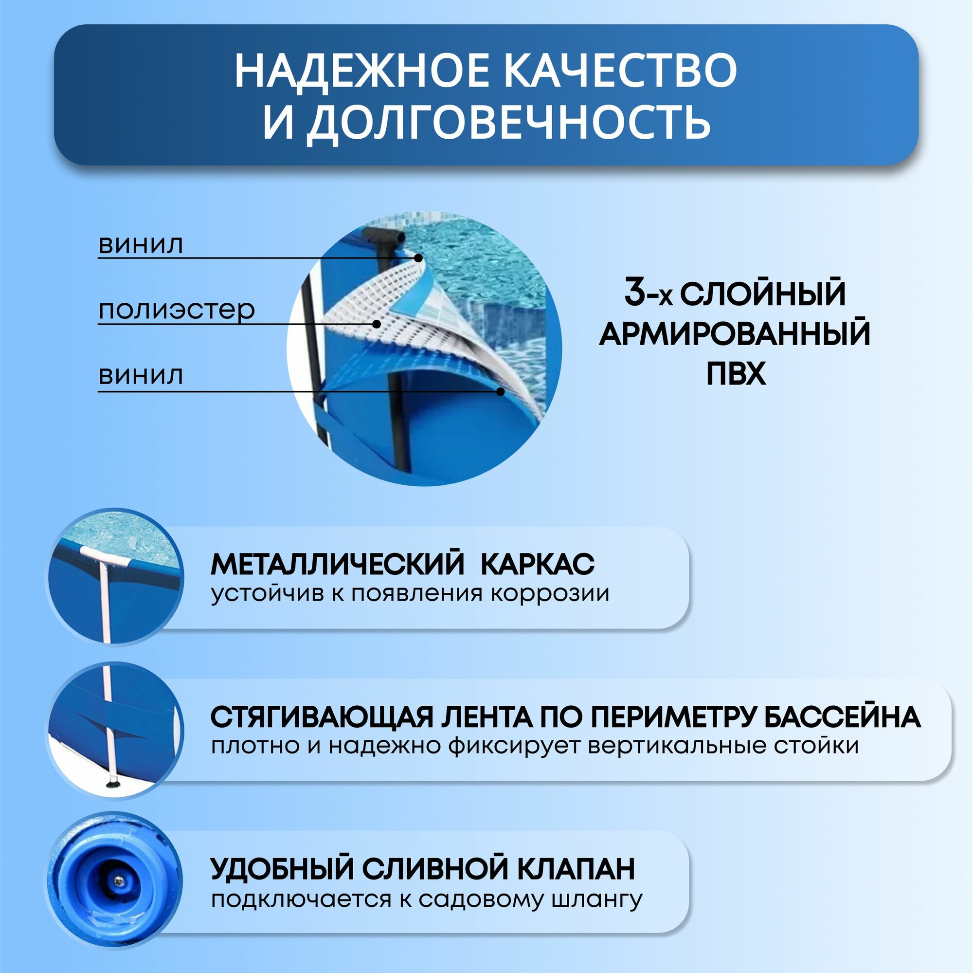 | Отзыв: | Прекрасный бассейн, приобрела второй уже. Первый отслужил 6 лет ( активного использования, не бережного хранения).