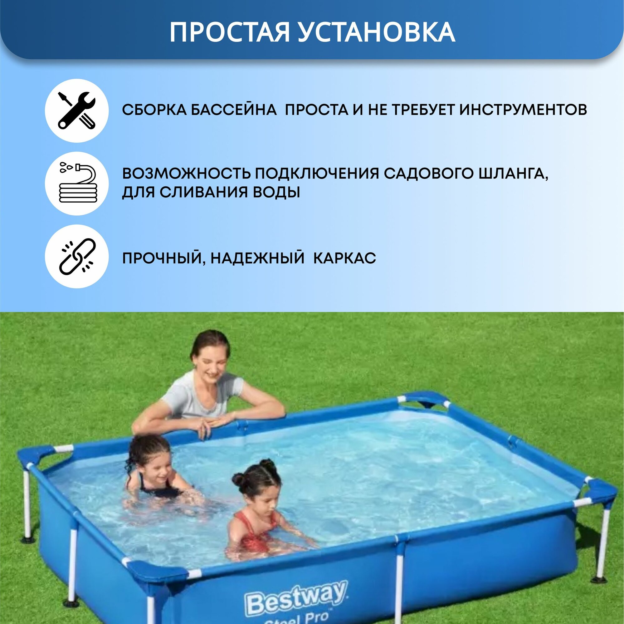 Бассейн каркасный прямоугольный 3300л 300х201 h66см 3 слоя металлический каркас, сливной клапан