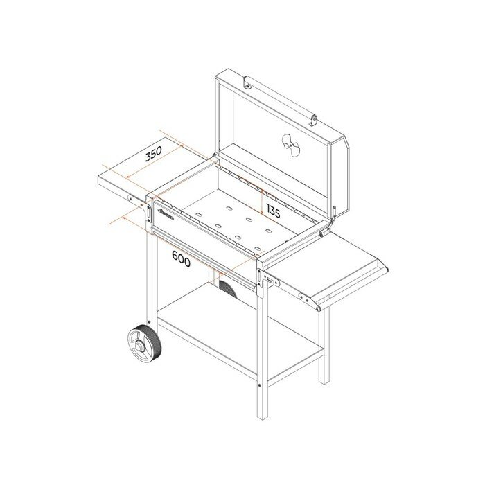 Две полки боковые, одна снизу, плюс зольник. Верхняя крышка с градусником. Гриль на колёсах.