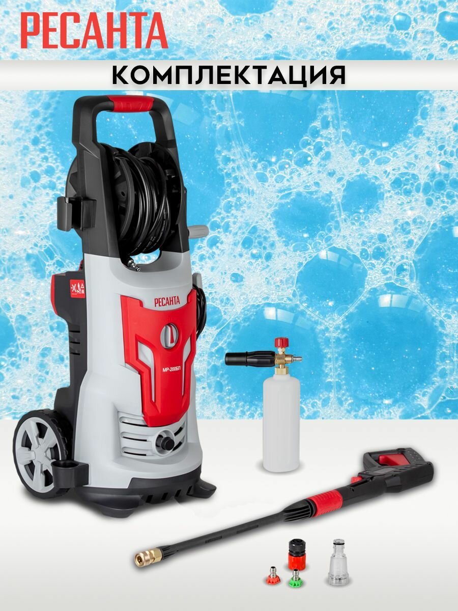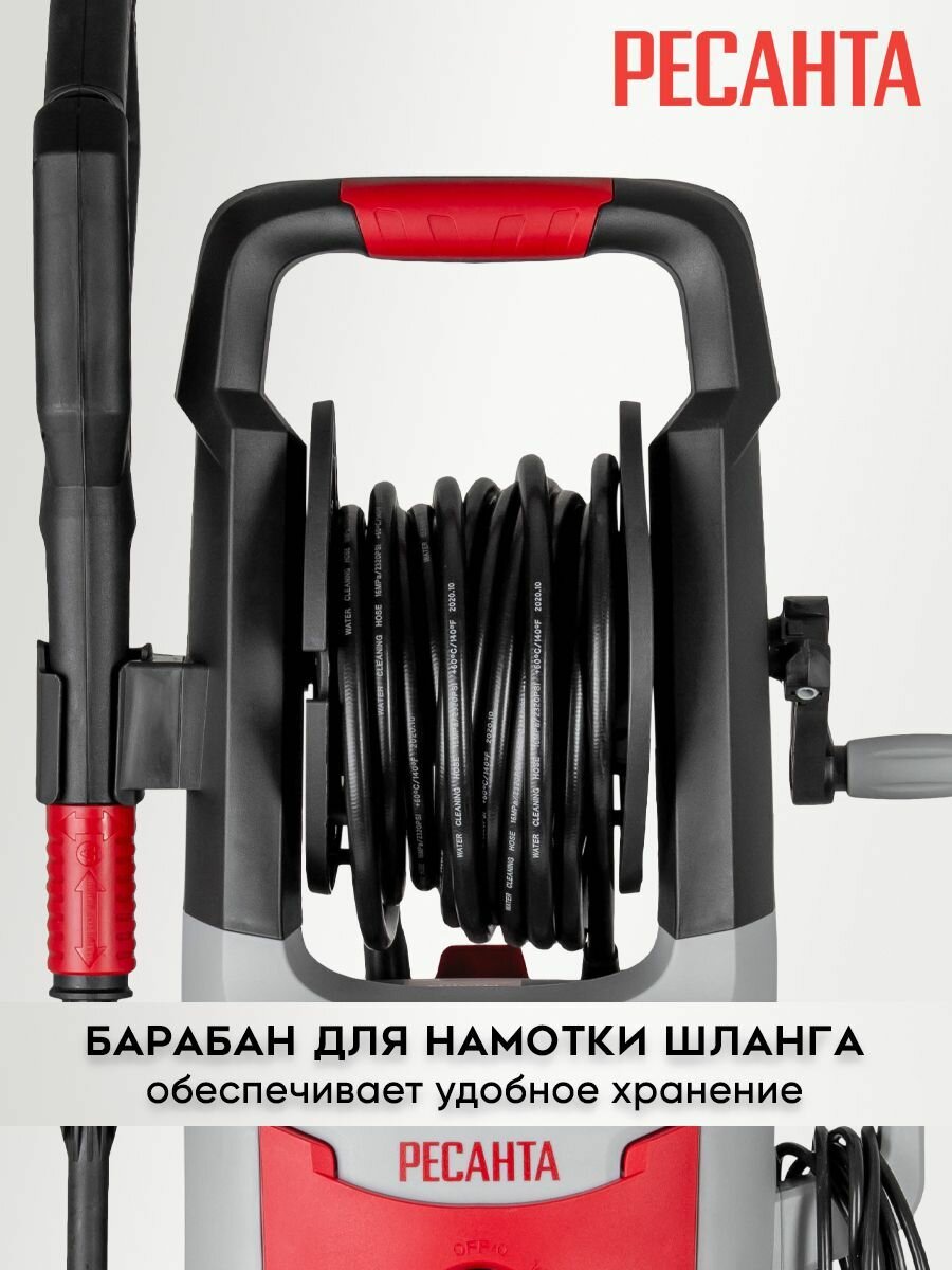 Мойка высокого давления РЕСАНТА МР-200БП, 2500 Вт, 200 Бар, 420 л/ч, шланг–8 м, барабан для шланга, проф. пеногенератор