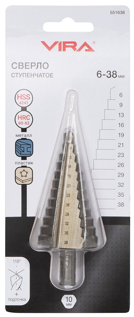 Купить Сверло ступенчатое с трехгранным хвостовиком 6 - 38 мм VIRA