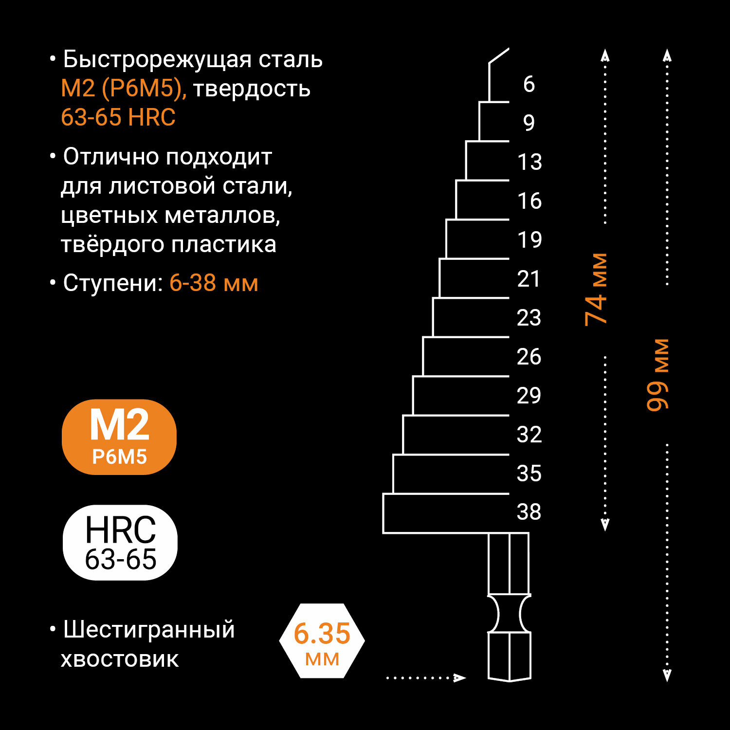 Купить Сверло ступенчатое Р6М5 с шестигранным хвостовиком 6 - 38 мм RAGE by VIRA