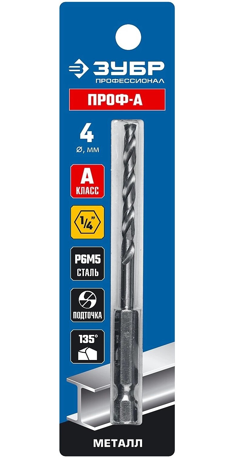 ЗУБР ПРОФ-а, 4.0 х 93 мм, сталь Р6М5, класс А, шестигранный хвостовик, сверло по металлу, Профессионал (29623-4)