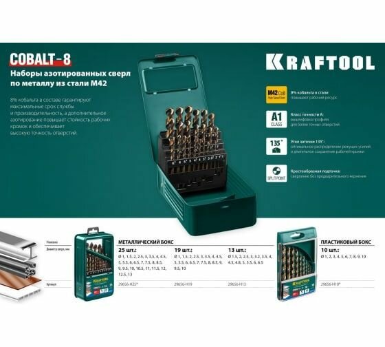 KRAFTOOL COBALT 13шт(1.5-6.5мм), Набор сверл по металлу HSS-Co(8%), сталь М42(S2-10-1-8)