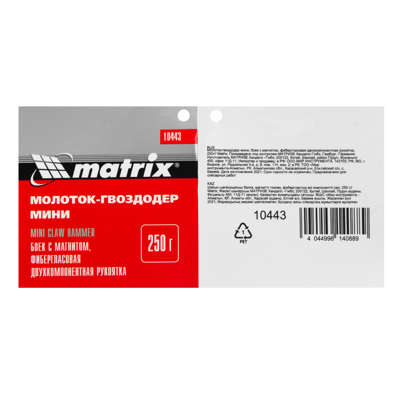 Молоток-гвоздодер мини MATRIX 10443, боек с магнитом, фибергласовая двухкомпонентная рукоятка, 250 г