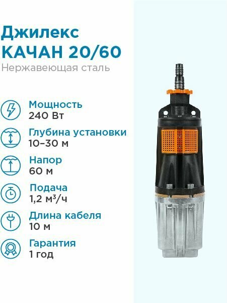 Насос колодезный ДЖИЛЕКС качан 20/60-10 - 0,24 кВт (Qmax 1,2м³/ч, Hmax 60м, кабель 10м)