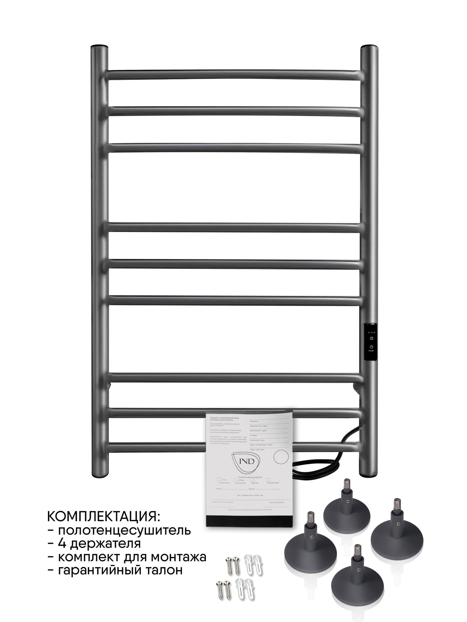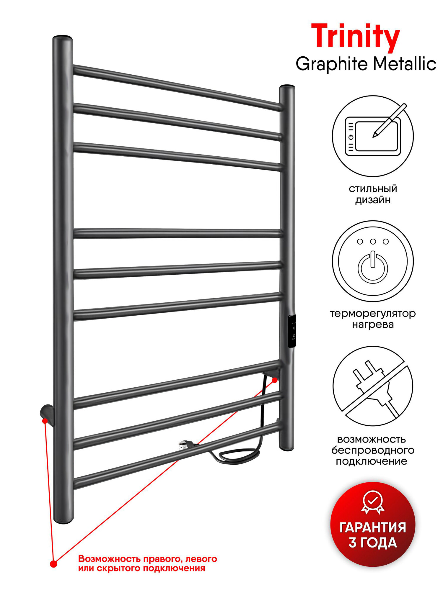 Полотенцесушитель электрический INDIGO Line Trinity 80/40 таймер, скрытый монтаж, универсальное подключение, Черный муар