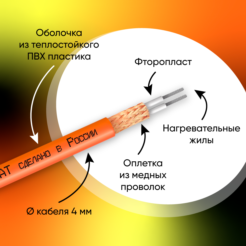 | Дополнительная информация | напряжение питания - 220 В; диаметр кабеля - 4 мм; удельное тепловыделение кабельной секции - 8 Вт/м |