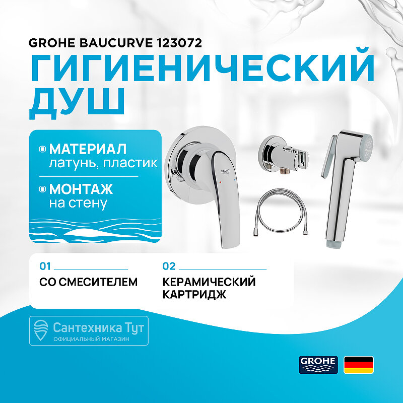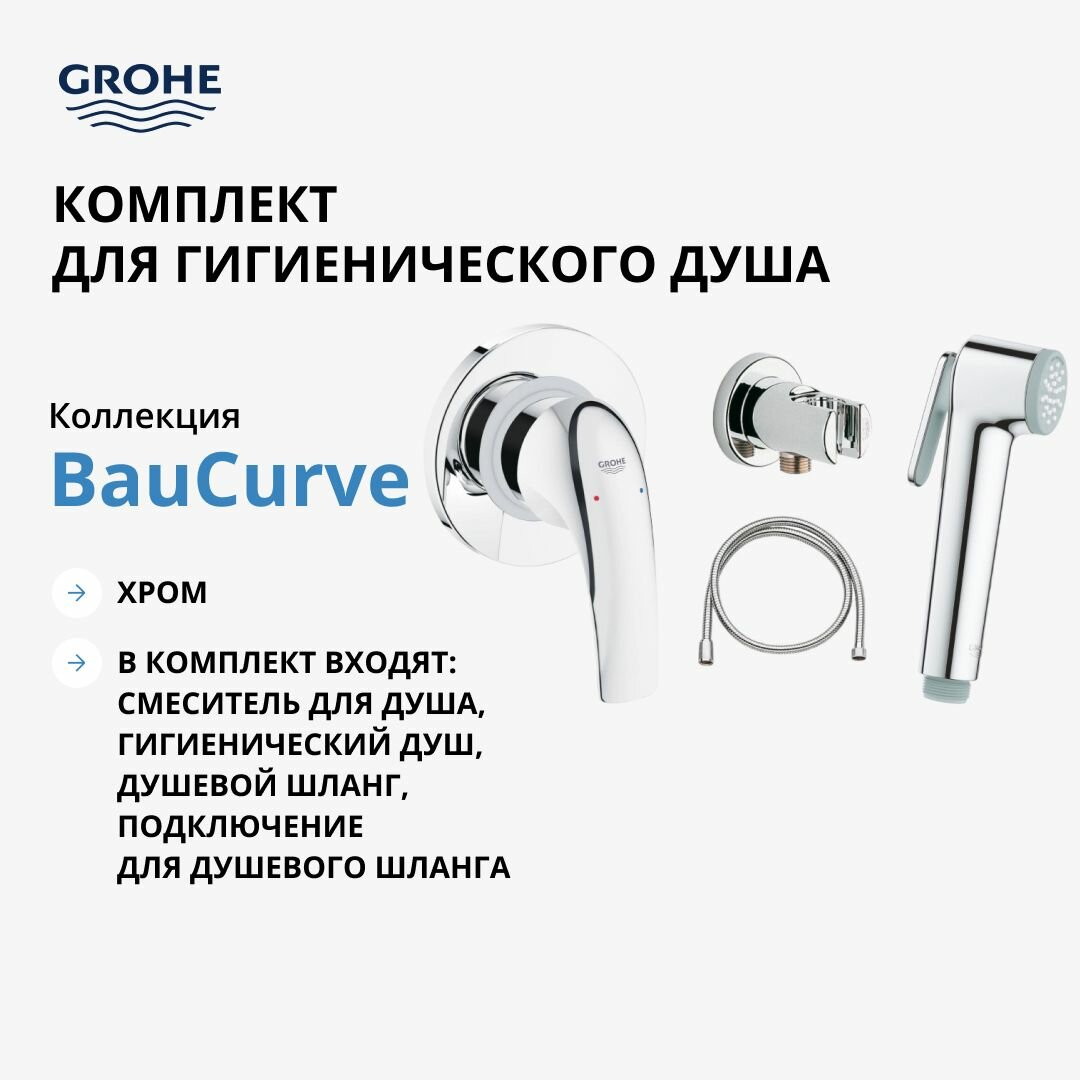 Готовый комплект для гигиенического душа GROHE BauCurve: встраиваемый смеситель, ручной душ со шлангом и держателем, хром (123072)