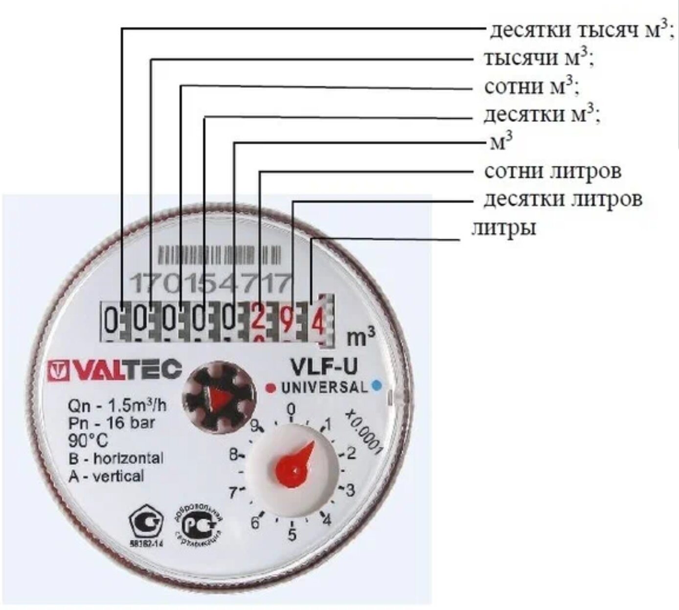 Водосчетчик VALTEC универсальный квартирный без сгонов, до +90С, 1,5м3, 1/2, 80 мм