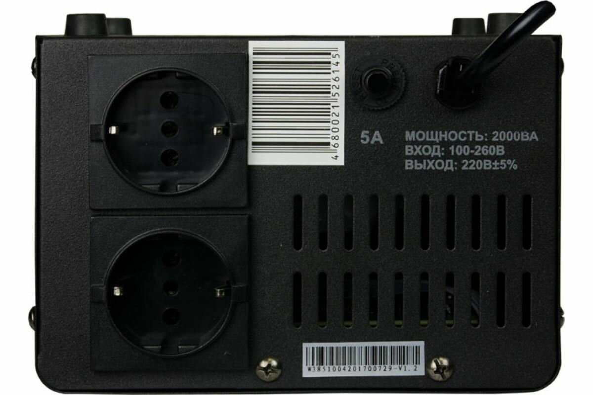 | Дополнительная информация | мин. входное напряжение (предельное): 95 В; макс. входное напряжение (предельное): 280 В; мин. выходное напряжение (фазное): 209 В; макс. входное напряжение (рабочее): 260 В; макс. входная частота: 50 Гц; мин. входная частота: 50 Гц; количество выходных розеток (общее): 2 шт.; время отклика: 10 мс; количество ступеней стабилизации: 7 шт. |