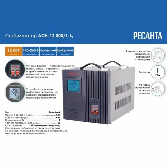 Стабилизатор напряжения Ресанта АСН-12000/1-Ц, 12000 Вт