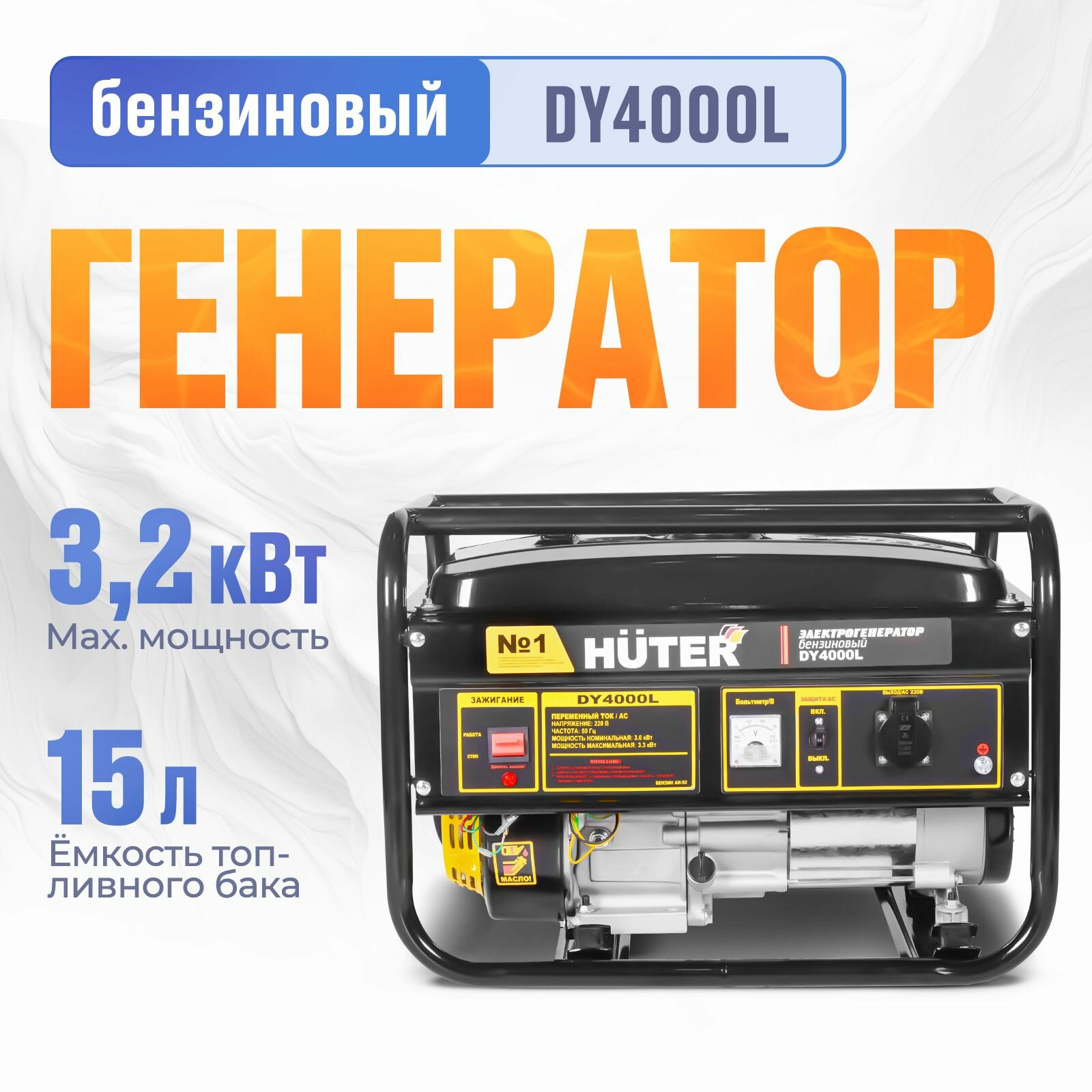 HUTER Генератор бензиновый Huter DY4000L, 4Т, 7 л.с., 3.2 кВт, выходы 220 В, 15 л
