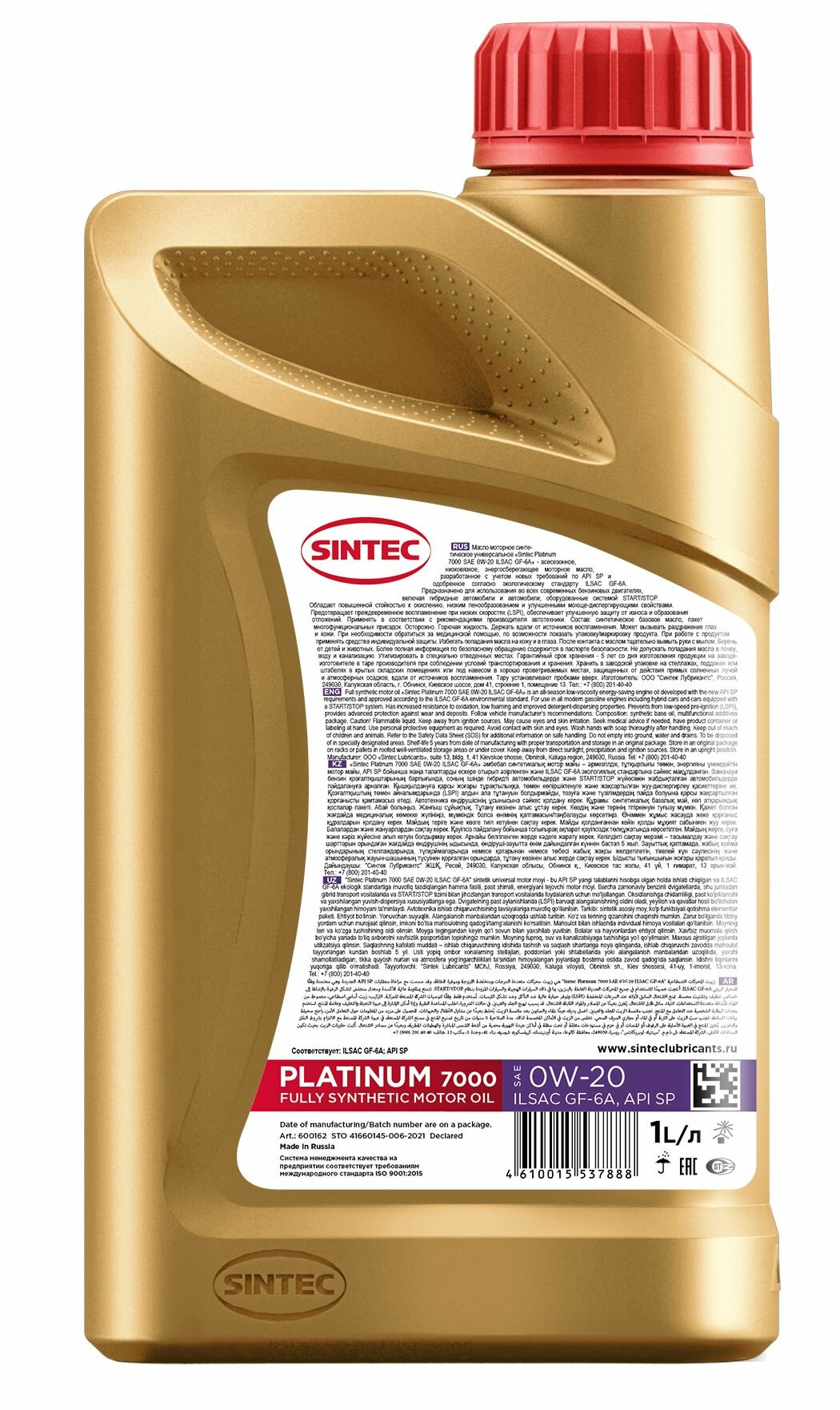 Моторное масло SINTEC PLATINUM 7000 SAE 0W-20 API SP, ILSAC GF-6A Синтетическое 4 л