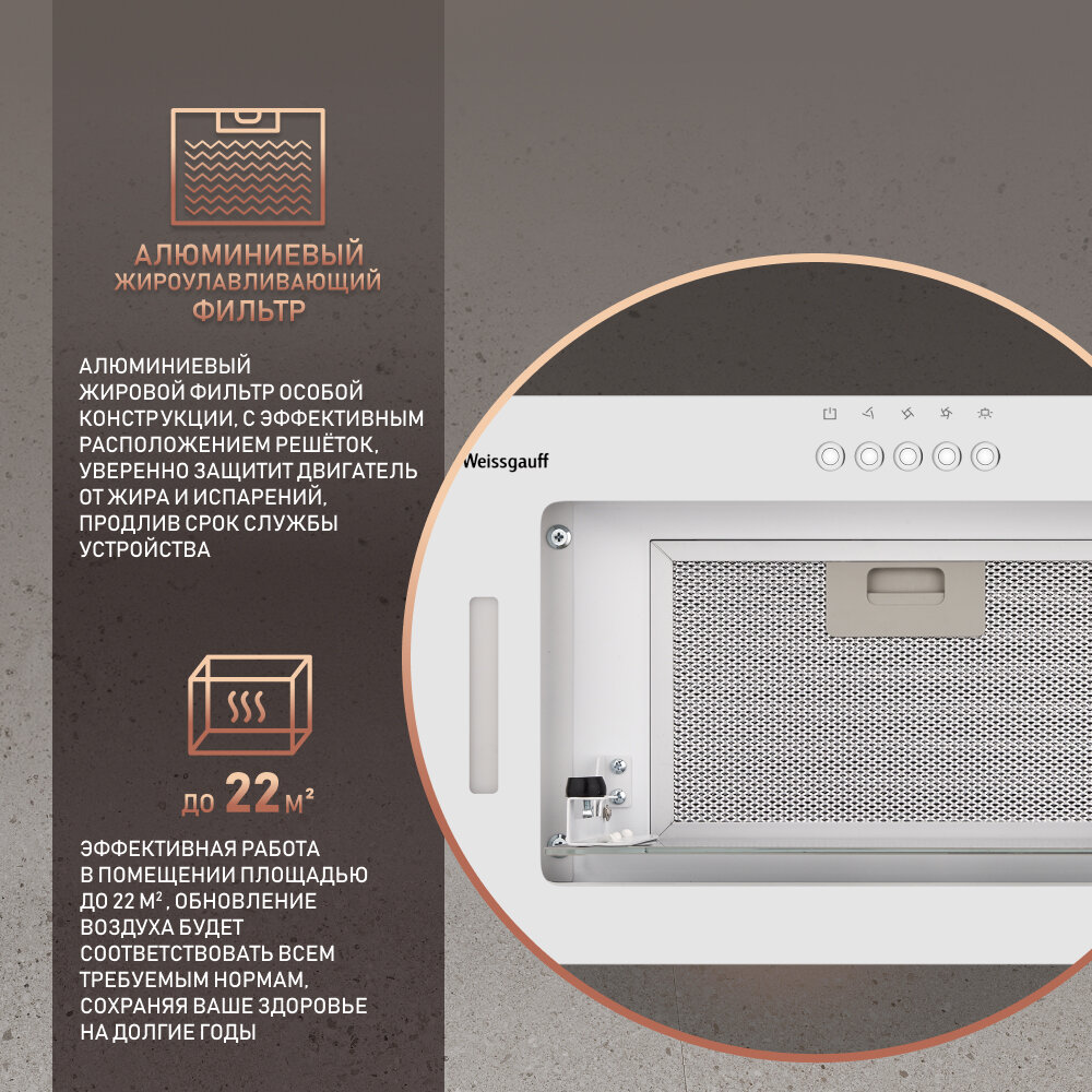 Купить Кухонная встраиваемая вытяжка Weissgauff Antlia 850 WH 3 года гарантии, Алюминиевый жировой фильтр, Низкий уровень шума