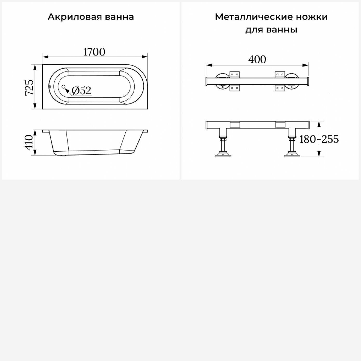 Акриловая ванна 170х75 см Lavinia Boho Art набор 2 в 1 S1-37080075: пристенная ванна, усиленный металлические ножки