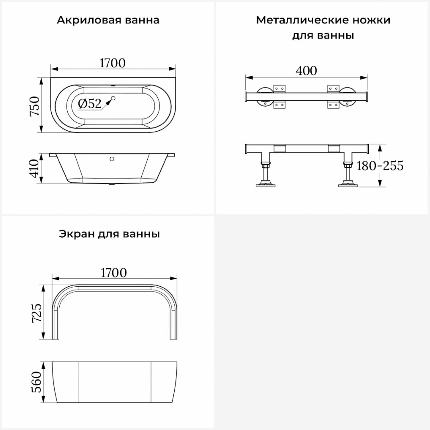 Акриловая ванна 170х75 см Lavinia Boho Art набор 3 в 1 S2-37080075: пристенная ванна, металлические ножки, лицевой экран