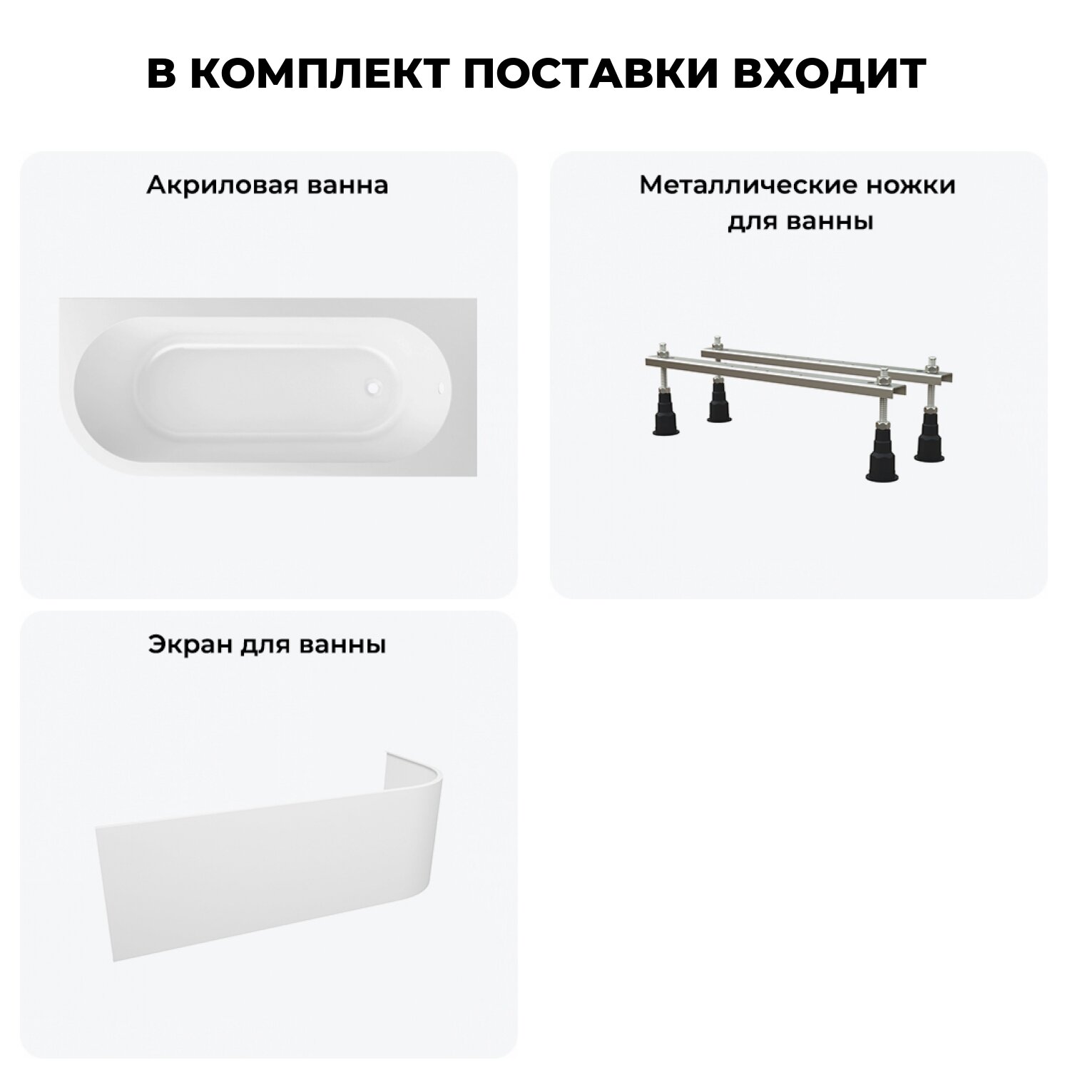 Пристенная ванна акриловая 170x75 Lavinia Boho Art S2-37080075 в наборе 3 в 1: полукруглая ванна 170 x 75 см, ножки, экран