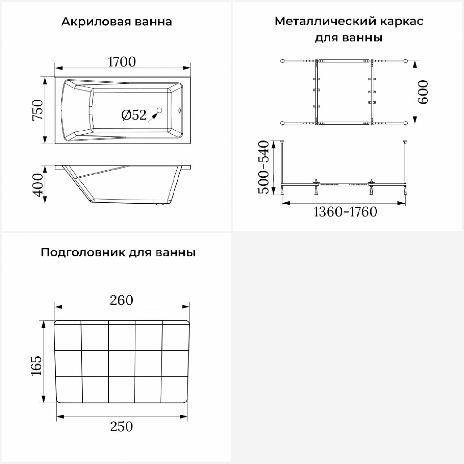 Акриловая ванна 170х70 см Lavinia Boho One набор 3 в 1 S1-3701007P: прямоугольная ванна, металлический каркас, подголовник