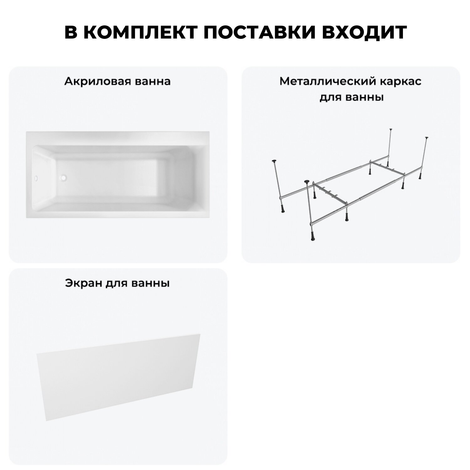 | Подробная комплектация | акриловая ванна Catani 160x80 см; усиленный металлический каркас с монтажным набором Complement; ультраплоский лицевой (фронтальный) экран Complement; инструкция по монтажу и эксплуатации; гарантийный талон. |