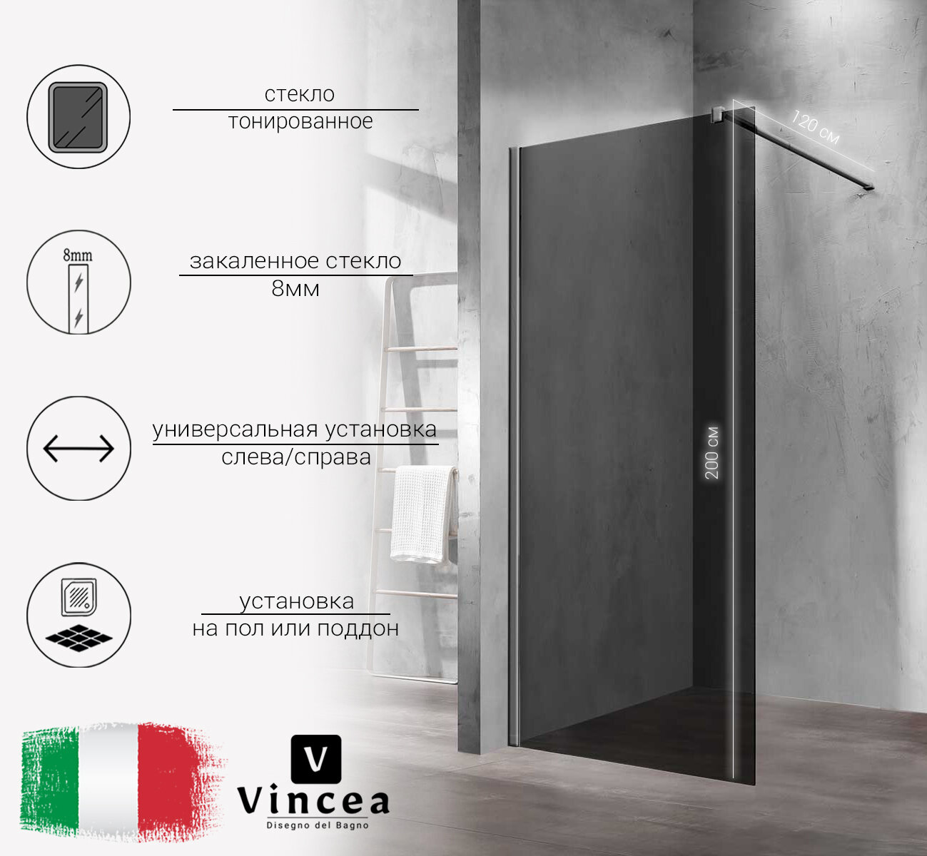 Душевая перегородка Vincea Walk-In VSW-1H900CGGM, 900х2000, вороненая сталь, стекло тонированное