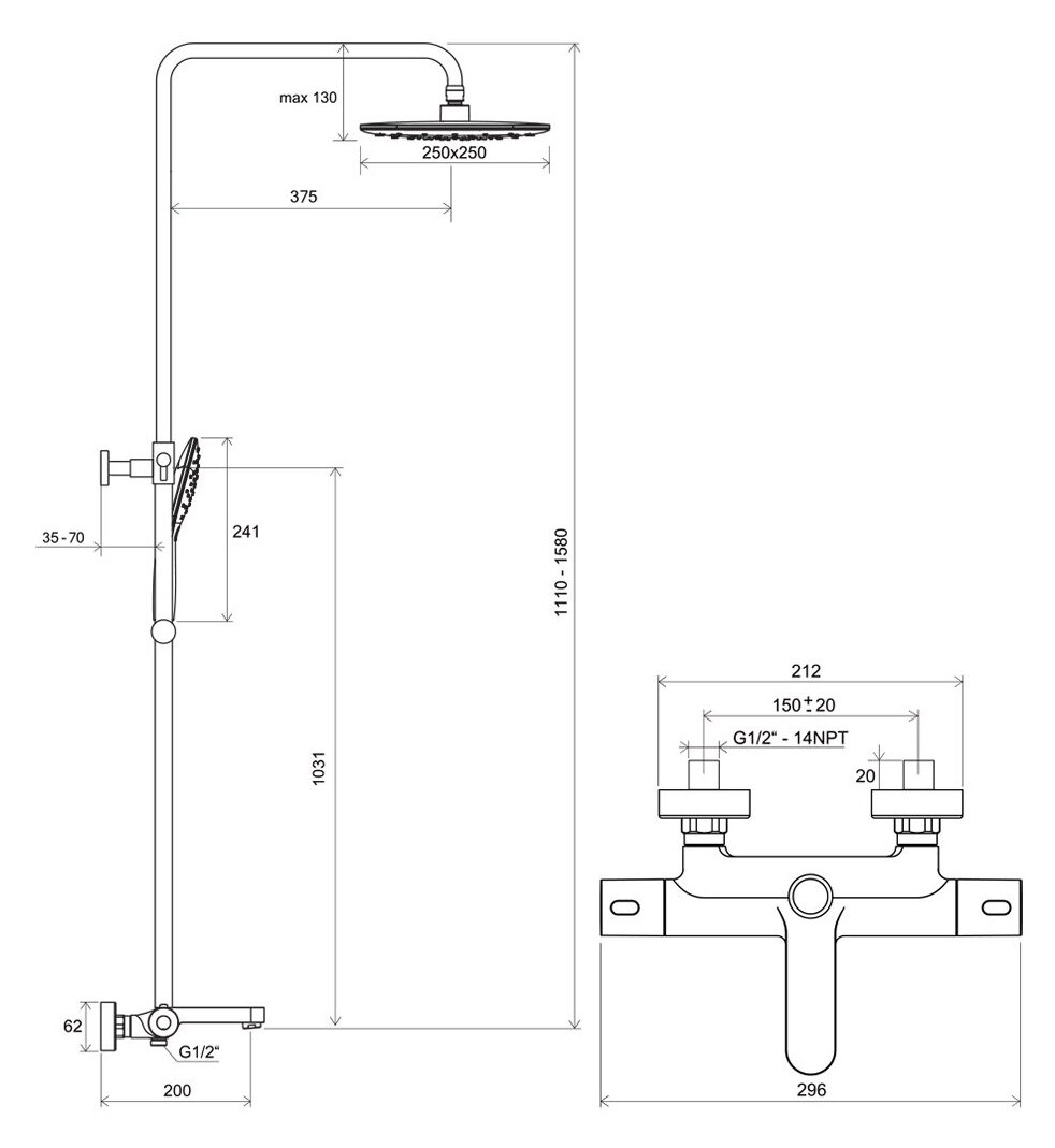 Душевая система Ravak TE 092.00/150 Termo 300 X070098 с верхним душем d250 мм F1 и лейкой d120 мм F3 с термостатом