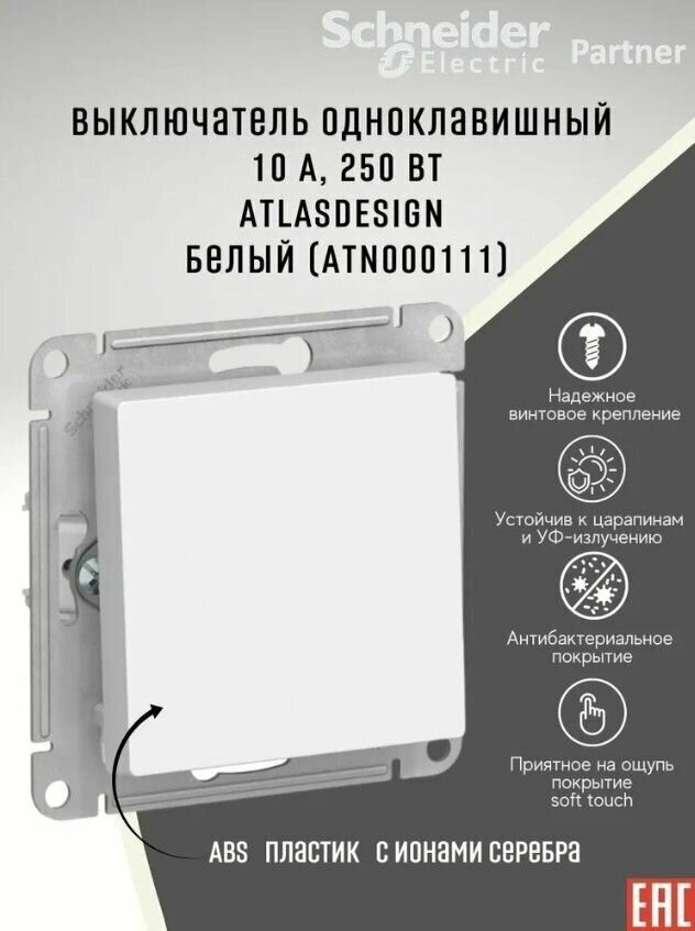 Выключатель Systeme Electric / Систем Электрик AtlasDesign, 10АХ схема 1, белый одноклавишный, ATN000111 / переключатель