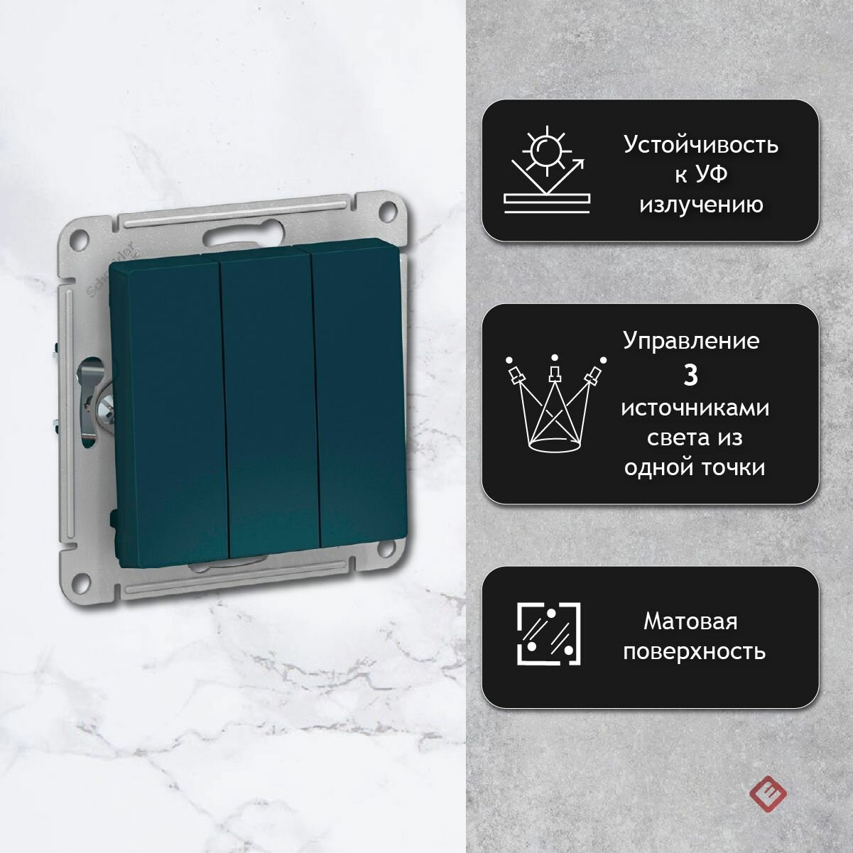 Выключатель трехклавишный Systeme Electric Atlas Design, на винтах, изумруд