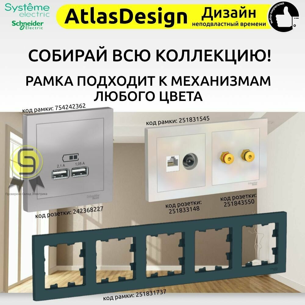 Розетка одноместная компьютерная электрическая Systeme Electric Atlas Design RJ45 кат.5E, Грифель ATN000783 - 5 шт.