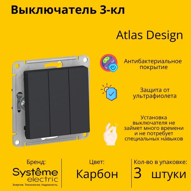 Выключатель электрический Systeme Electric Atlas Design 3-клавишный, 10А, 10 AX, Карбон ATN001031 - 10 шт.