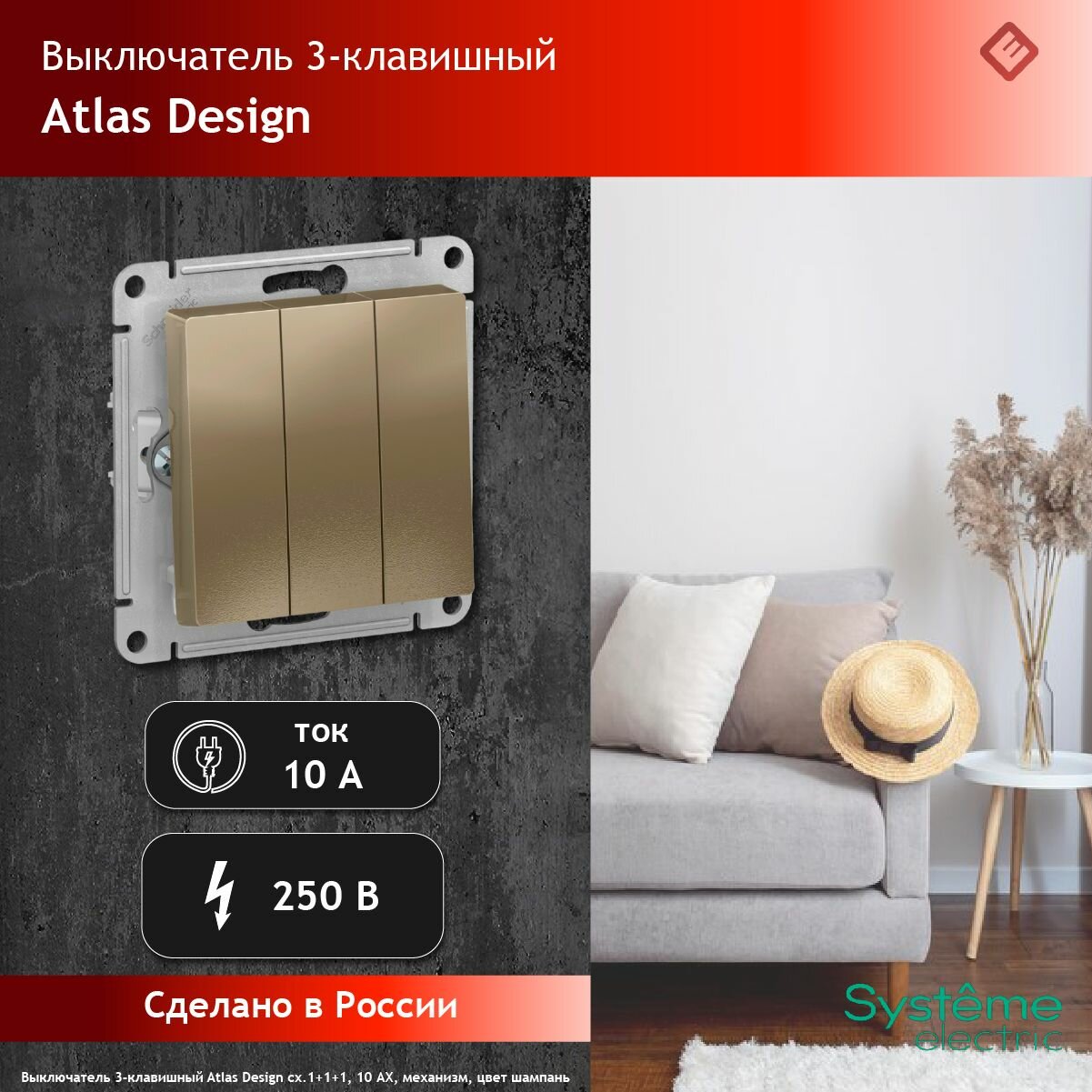 СохранитьВыключатель трехклавишный сх.1+1+1, 10АХ, механизм Шампань, Schneider Electric AtlasDesign (комплект 2шт) интересное: