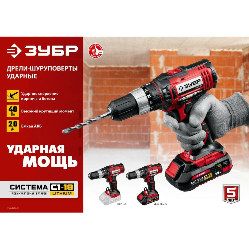 Дрель-шуруповерт ударная ЗУБР С1-18, 18 В, 40 Н·м, 2 АКБ (2 А·ч), кейс (ДШУ-185-22)
